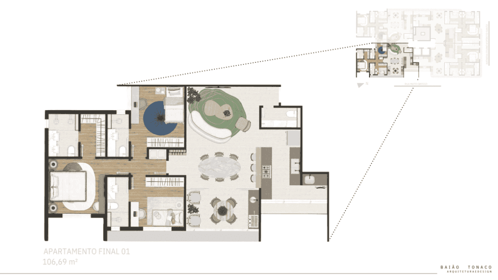 Modelo de arquitetura inovador com instalações modernas e um design aconchegante, em uma experiência única de harmonia. Planta: 106,69 m²